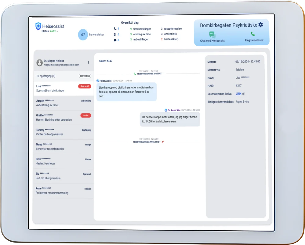 Vi videreformidler kommunikasjon med leger gjennom vårt interne kommunikasjonsverktøy.